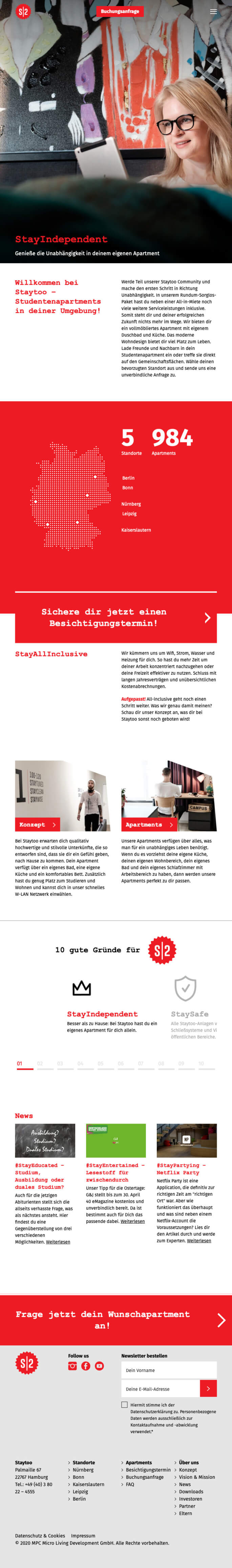 Für die junge und frische Marke Staytoo kreiert DRID einen ebenso innovativen wie modernen Web-Auftritt. Dabei werden knallige Farben und emotionale Bildwelten mit modernen Navigations- und Designelementen kombiniert. Wichtiger Bestandteil ist das UX-optimierte Buchungsanfrage-Tool, worüber Interessenten Anfragen konfigurieren und Besichtigungstermine reservieren können.