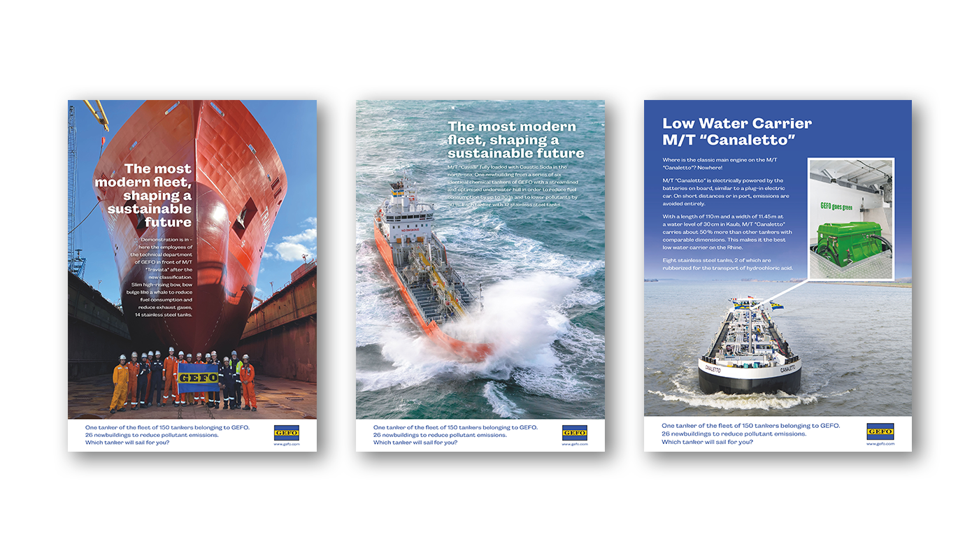 Für die GEFO konzipieren wir mehrere Fachkampagnen, die sich hauptsächlich an Entscheider der Schifffahrts- und der Chemiebranche richten. Die großformatigen Anzeigen sollen die Sichtbarkeit der Marke stärken und relevante Aspekte wie z.B. Innovationskraft, Nachhaltigkeit, Employer-Branding und Flottengröße thematisieren.