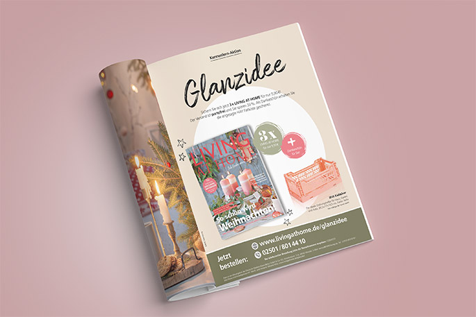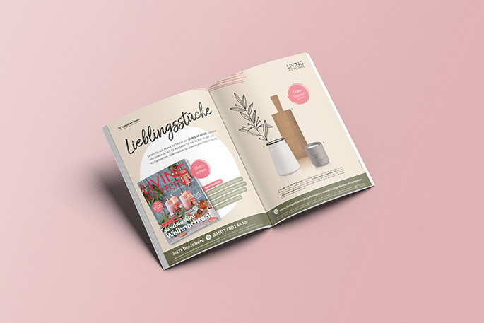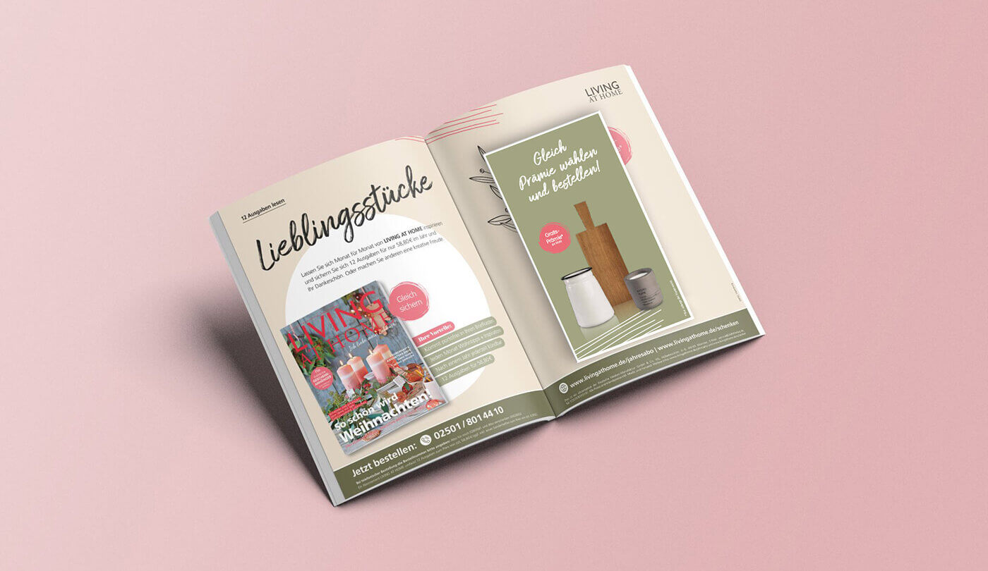 Die überarbeitete Printkampagne für LIVING AT HOME inszeniert das Thema „regelmäßiges Lesen“ als emotionales Erlebnis und Inspirationsquelle. Aus 5 verschiedenen Gestaltungs-Linien hat sich DMM für das Anzeigen-Designkonzept „Spot-on“ entschieden.