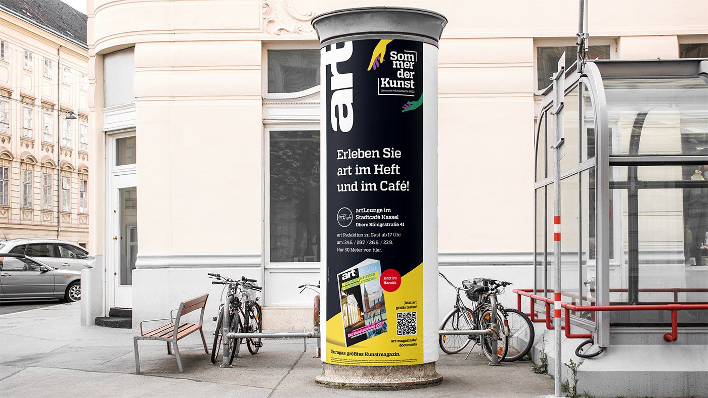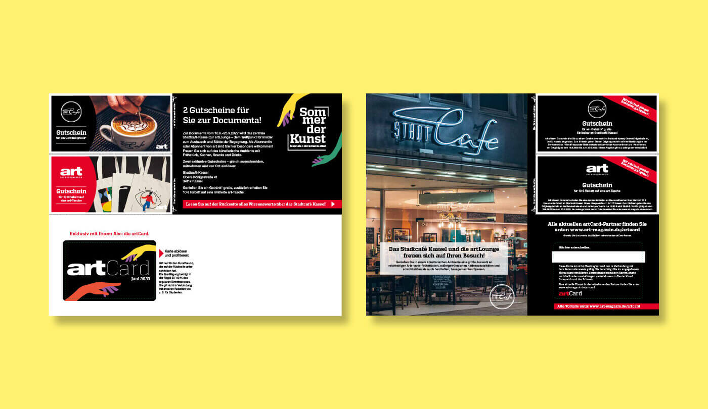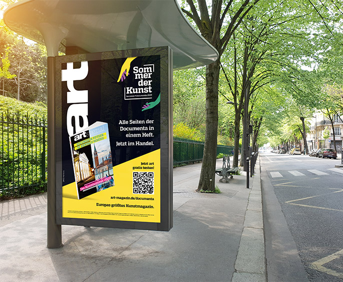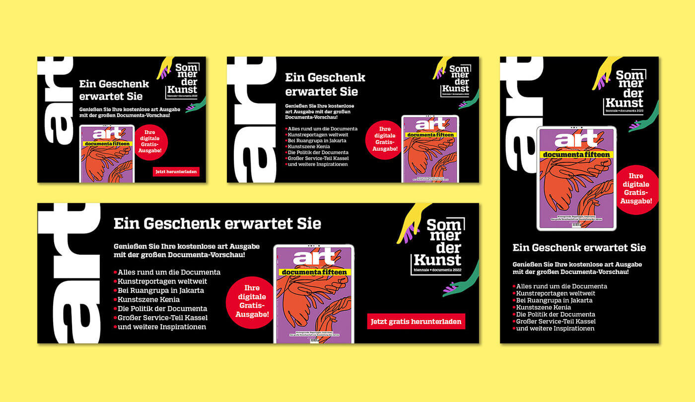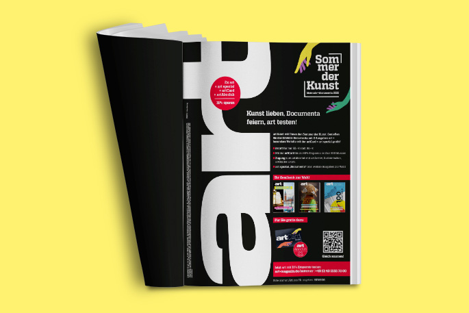 Zur Kundenbindung und Reaktivierung von ART Leserinnen und Leser werden klassische Printanzeigen im Documenta-Look, Printmailings, E-Mailings und Heftaufleger gestaltet. Social Ads sorgen für zusätzlichen Traffic und generieren Leads, die nach der heißen Phase des „Sommers der Kunst“ in Abos umgewandelt werden.