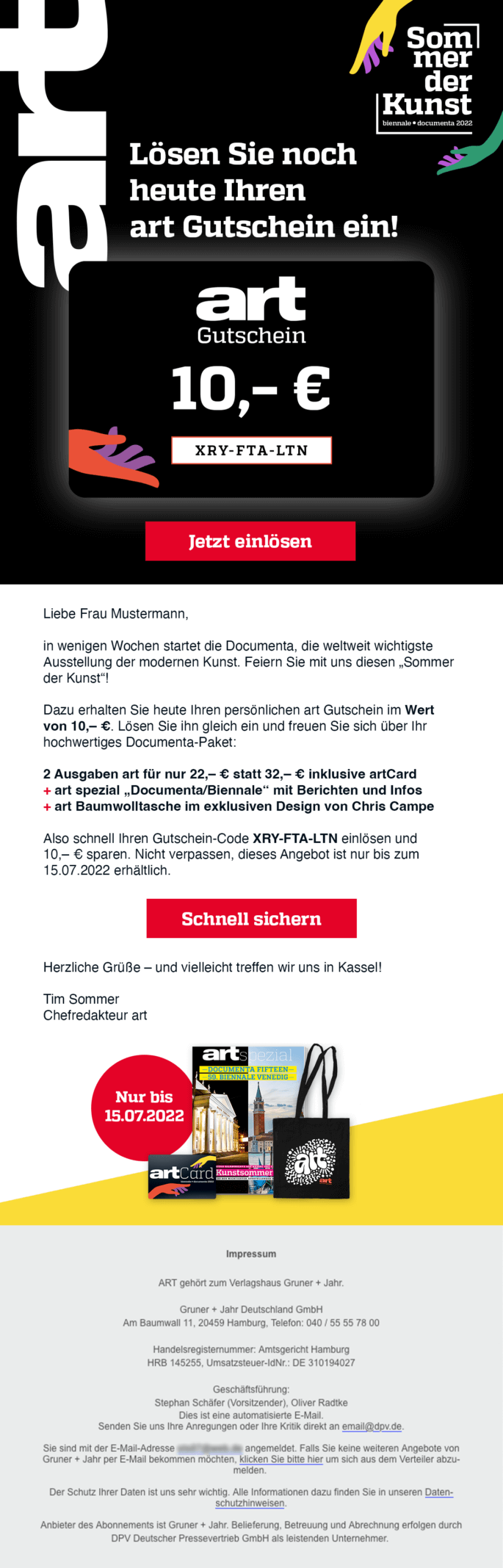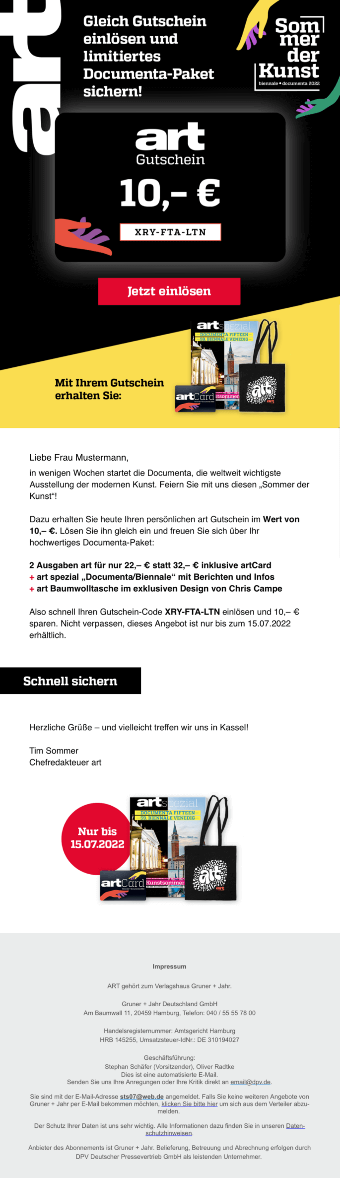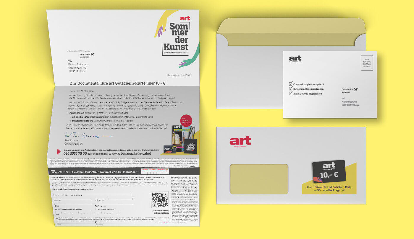 Zur Kundenbindung und Reaktivierung von ART Leserinnen und Leser werden klassische Printanzeigen im Documenta-Look, Printmailings, E-Mailings und Heftaufleger gestaltet. Social Ads sorgen für zusätzlichen Traffic und generieren Leads, die nach der heißen Phase des „Sommers der Kunst“ in Abos umgewandelt werden.