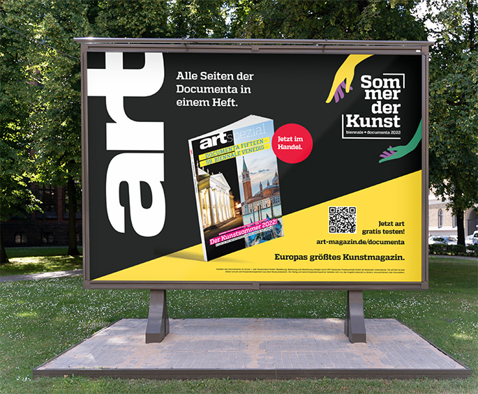 Für alle Marketingaktivitäten zur Documenta und zur Biennale Venedig hat DRID das Motto „Sommer der Kunst“ sowie ein eigenes Key-Visual mit zwei Händen entwickelt. Beide Elemente stehen im Mittelpunkt einer Vielzahl von Maßnahmen, die Kunstfreunde zum Bezug von Probeheften und einem speziellen Documenta-Abopaket aktivieren. Vor Ort in Kassel werden City-Light-Poster, Litfaßsäulen und weitere OOH- bzw. DOOH-Kanäle genutzt. Das zentral gelegene Stadtcafé Kassel wird zur Documenta-Zeit in die „Art Lounge“ umgestaltet.